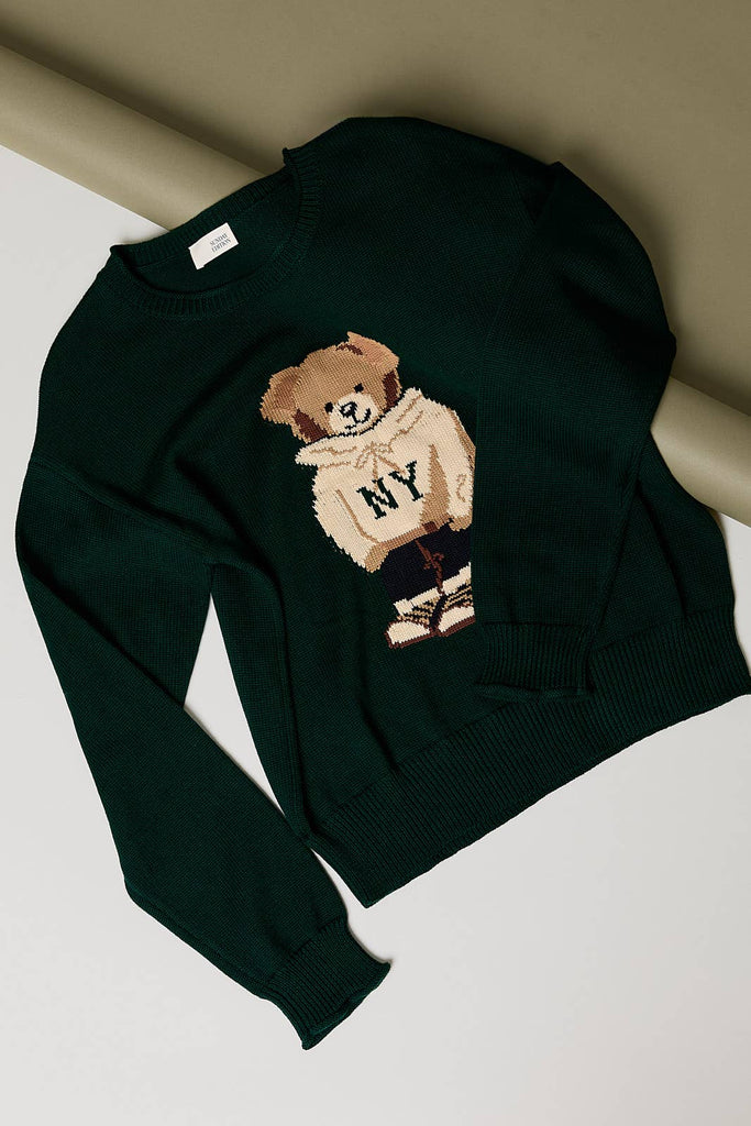 Cheer on the Jets in total comfort and style with our NY Jets Bear Sweater. Crafted from a soft knit fabric, this pullover features a playful teddy bear wearing a jet-green “NY” sweater, offset against a deep forest backdrop. Ribbed edges at the collar, cuffs, and hem add structure, while a relaxed fit gives it a laid-back feel that works for lounging, game day, or casual weekends.